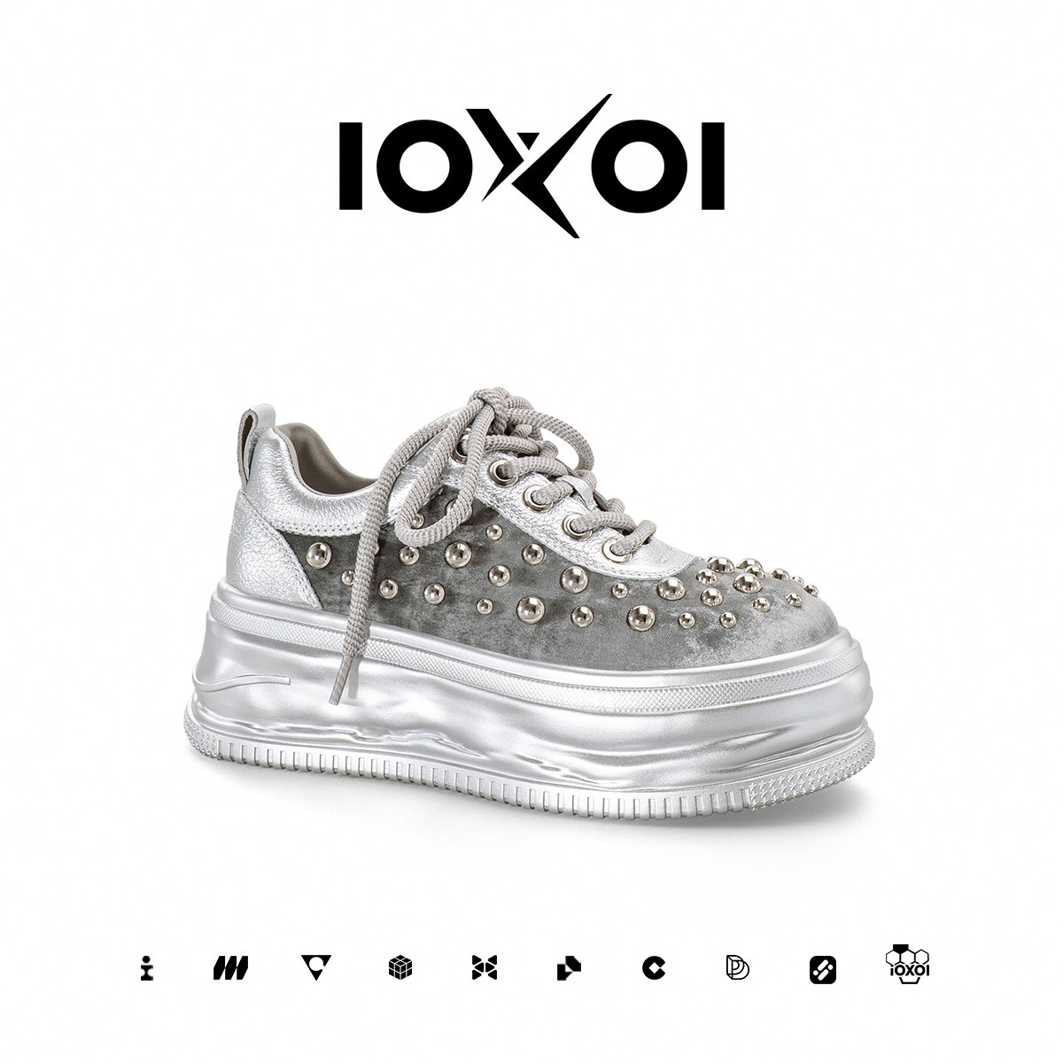 IOXOI2026春季新款松糕厚底鞋女增高板鞋银灰色丝绒铆钉休闲鞋子
