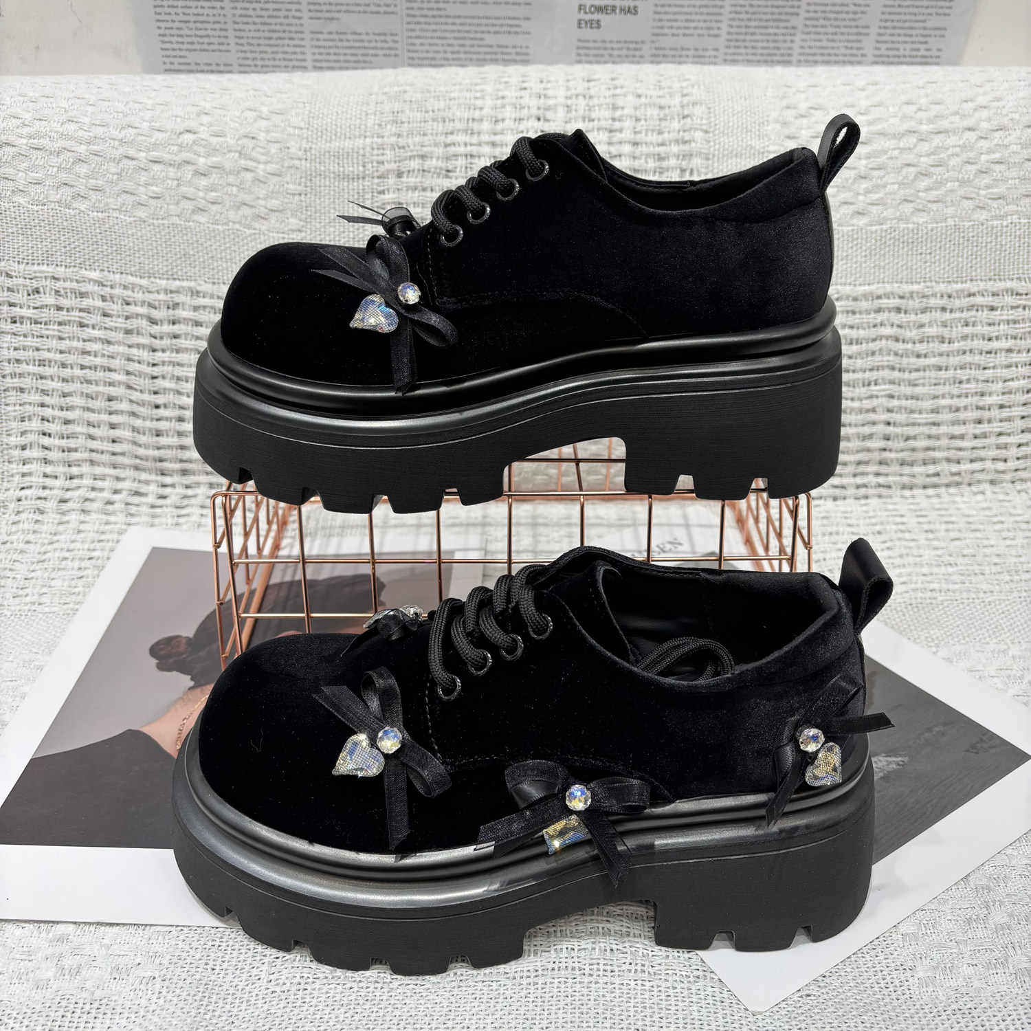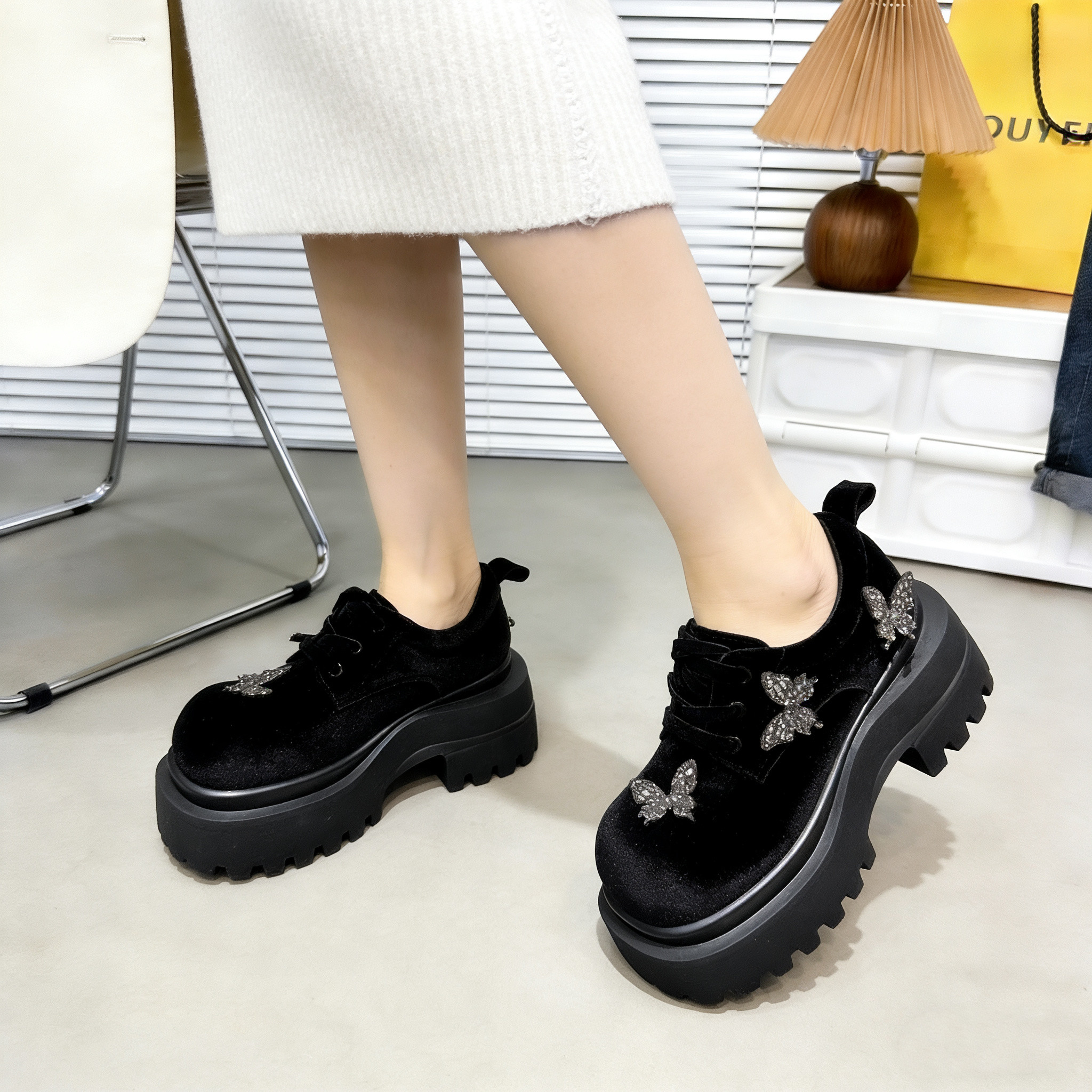 甜酷风金丝绒蝴蝶水钻系带JK小皮鞋乐福鞋厚底松糕复古单鞋女鞋潮