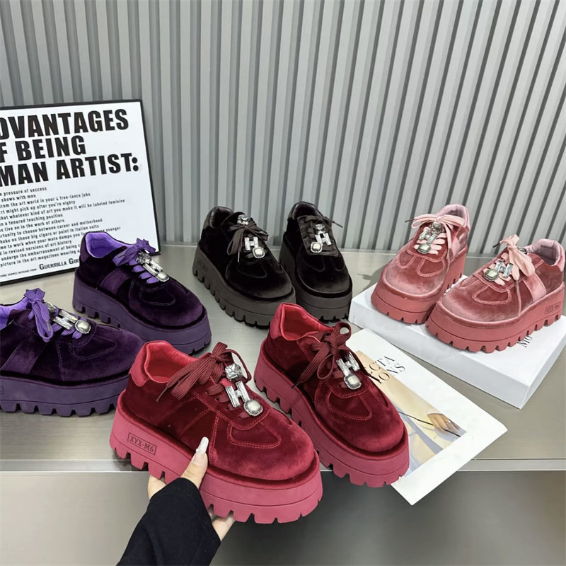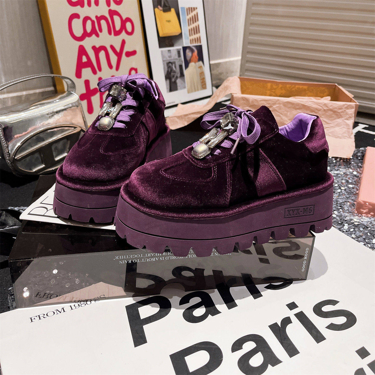欧货彩钻丝绒休闲鞋女2026新款厚底松糕系带低帮单鞋小个子乐福鞋