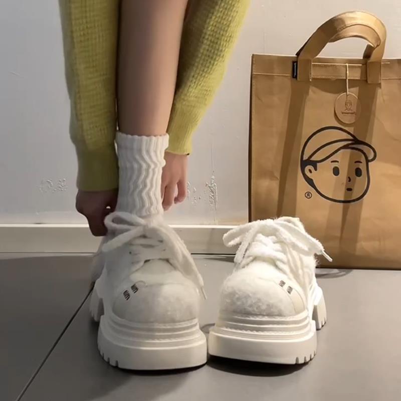 欧洲站女鞋2025年秋季新款系带圆头厚底休闲鞋女丝绒松糕跟老爹鞋