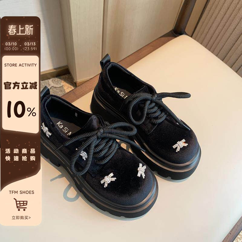 【TFM】乐福鞋女2026年春季新款水钻系带丝绒复古厚底女松糕单鞋