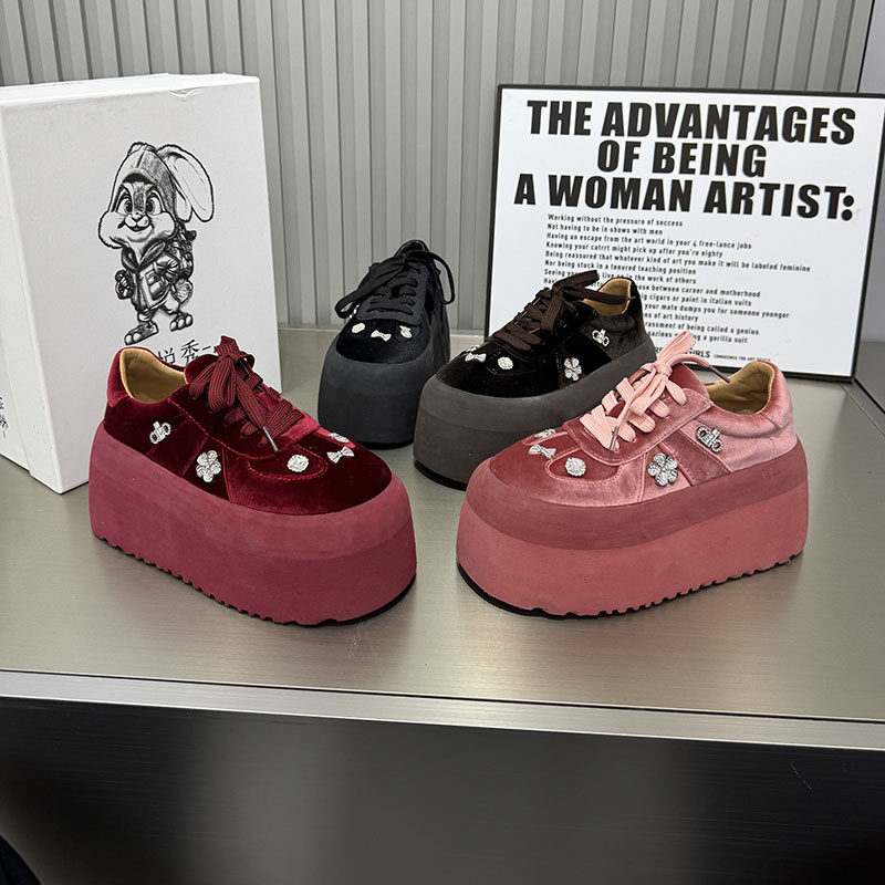 水钻金丝绒面系带松糕厚底德训鞋女面包鞋百搭小个子增高休闲板鞋