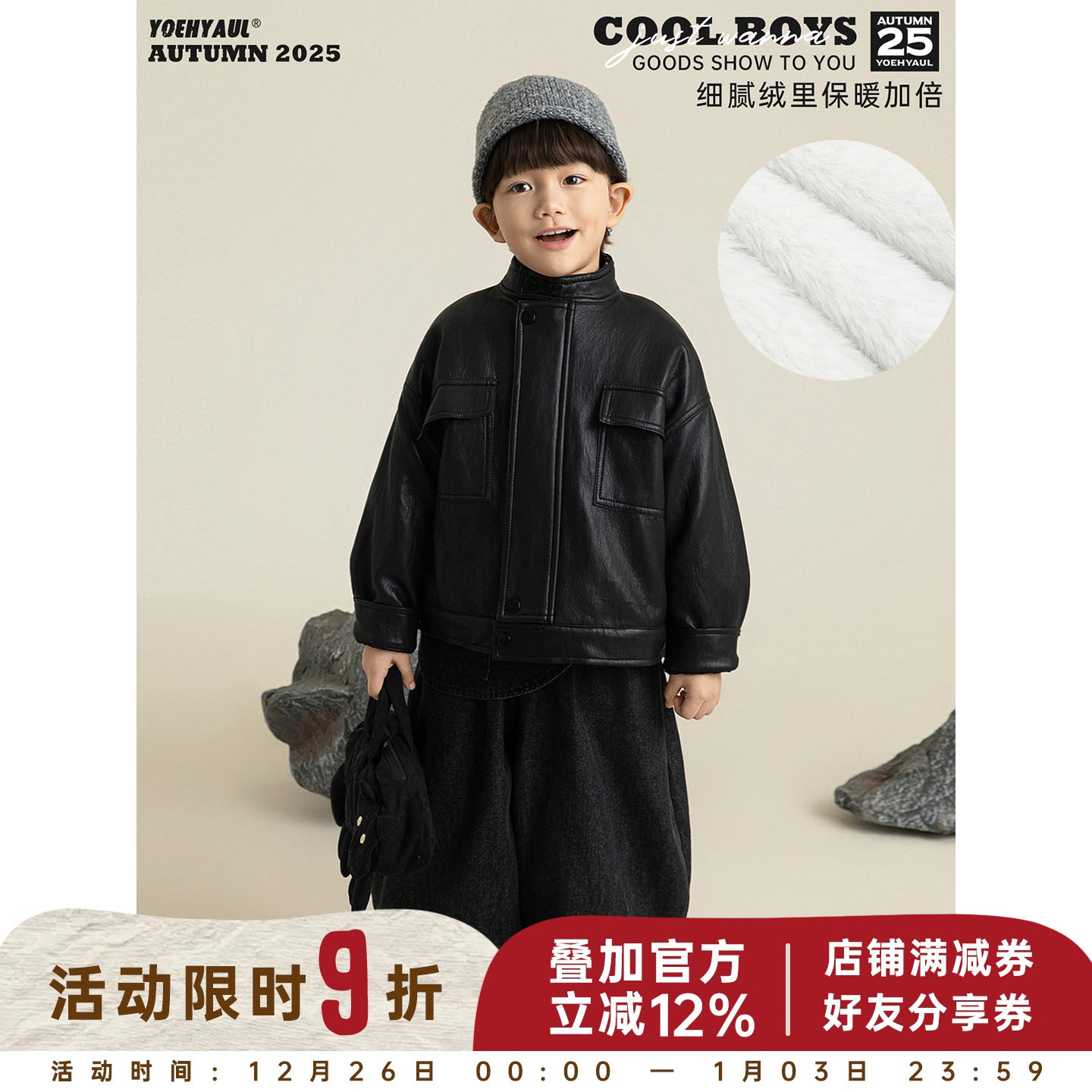幼悠男童加绒加厚立领复古皮夹克冬季洋气可爱时尚百搭保暖外套潮