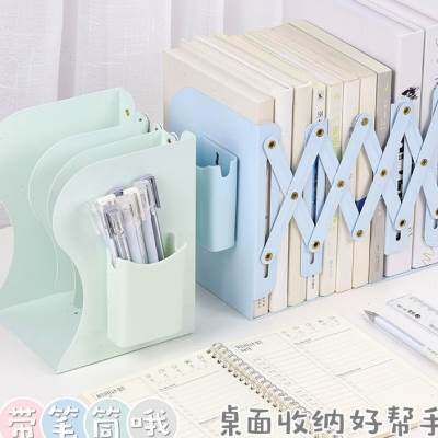 可伸缩金属书立带笔筒书架桌面书本折叠固定书本收纳架一体挡板书夹立架小学生用桌上初高中生创意放书收缩架