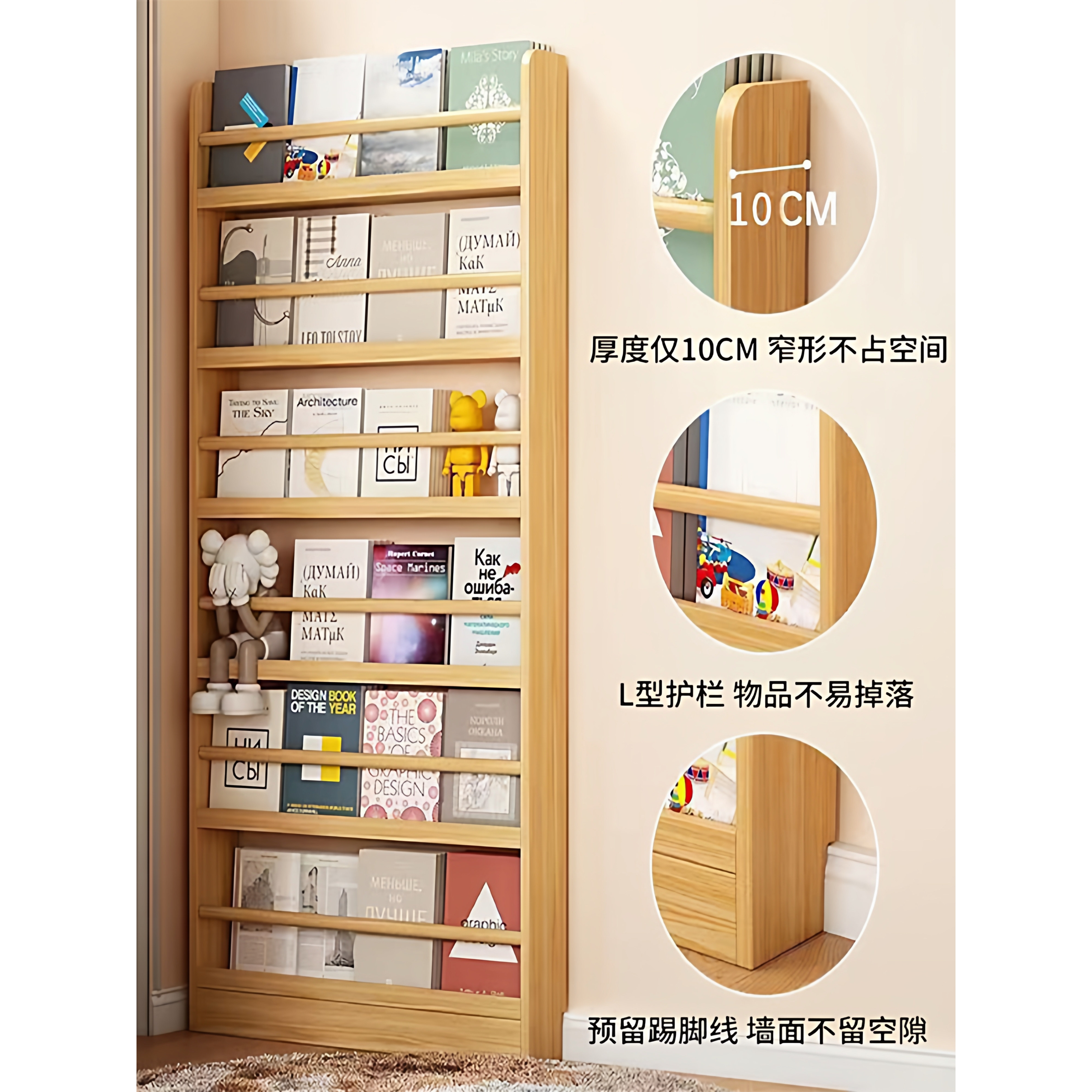 实木儿童书架落地置物架靠墙绘本架现代简约杂志架10cm门后薄柜