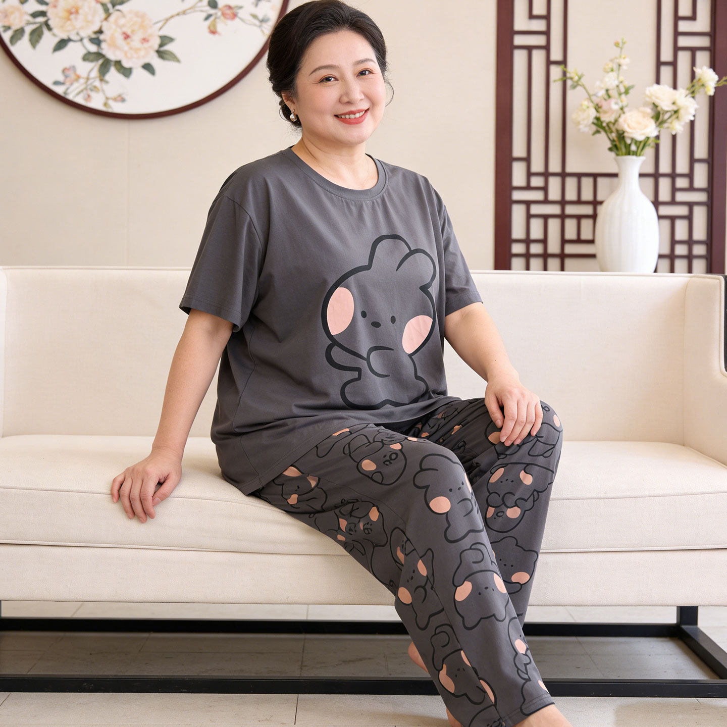 大码200斤中老年妈妈睡衣纯棉宽松短袖长裤可外穿家居服女夏薄款