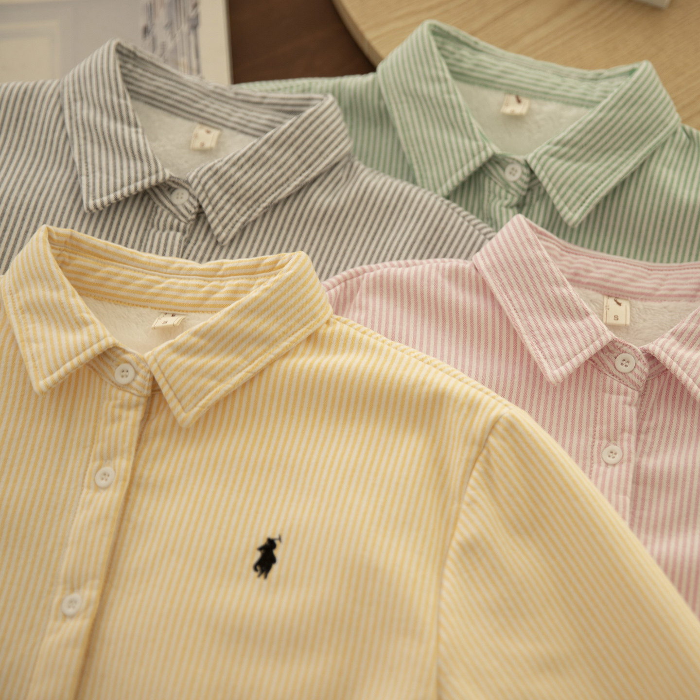 困冬 文艺条纹刺绣加绒加厚衬衫女秋冬打底保暖棉牛津纺通勤衬衣