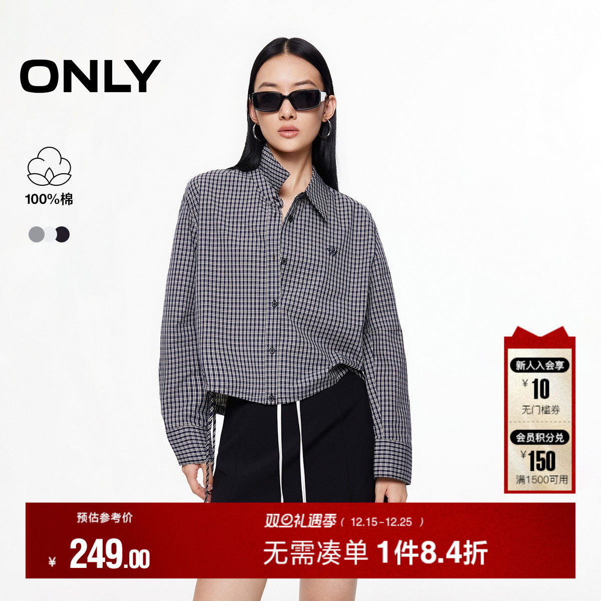 ONLY2025冬季新款文艺风刺绣装饰格子正肩翻领小个子短款衬衫女