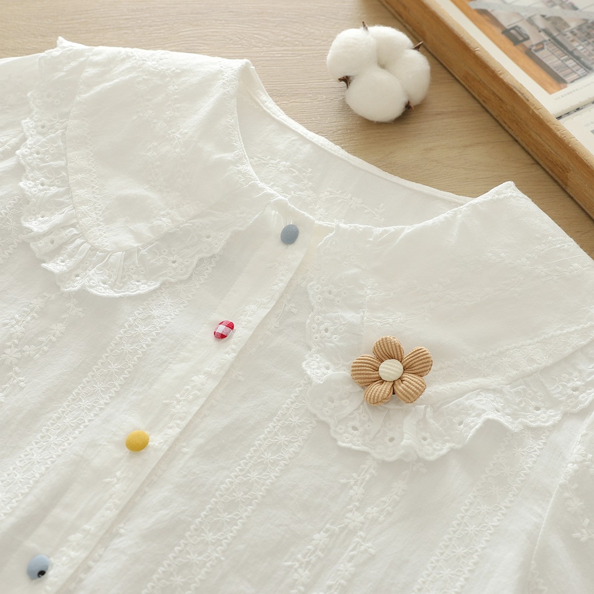 文艺小清新甜美蕾丝刺绣娃娃领立体花朵彩扣纯棉正肩白衬衫女长袖