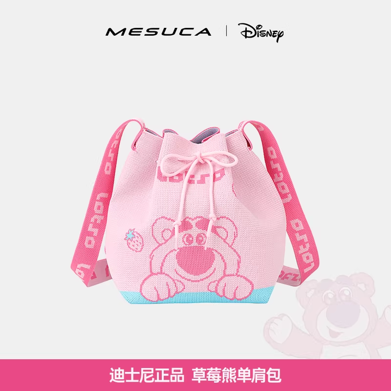 迪士尼草莓熊联名2025新款时尚百搭单肩包斜挎包抽绳束口包女手提