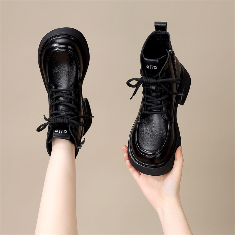 厚底圆头马丁靴女2025年秋冬新款学院风系带皮靴软底显高显瘦短靴