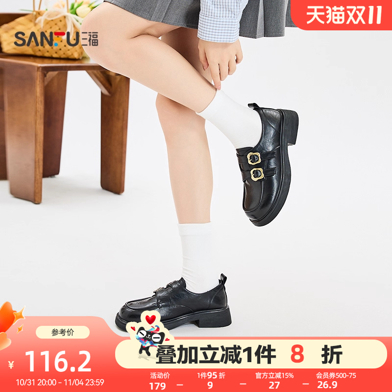 三福女乐福鞋秋季智性学院风双条带花扣圆头套口女鞋845981
