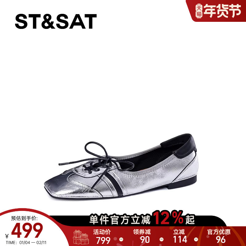 星期六芭蕾风浅口单鞋女2025年春季新款舒适真皮小皮鞋系带一脚蹬