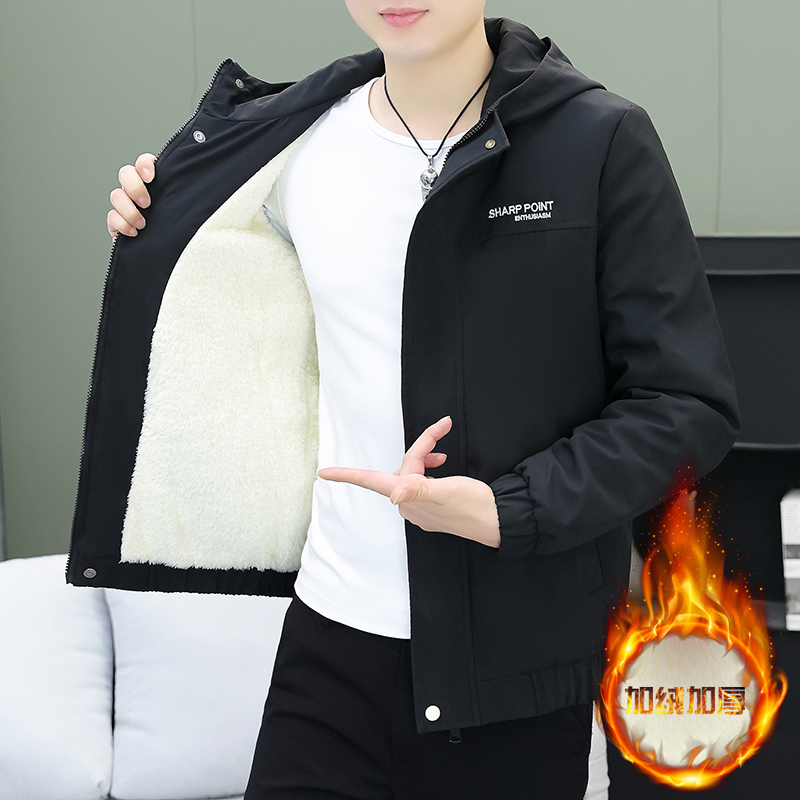 男士加绒秋冬季加厚休闲工装新款外套夹克男时尚连帽潮流青年棉衣