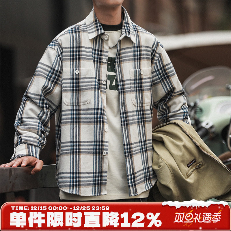 HEEMKIZOO春秋款日系复古格子条纹翻领衬衫男长袖衬衣外套潮情侣