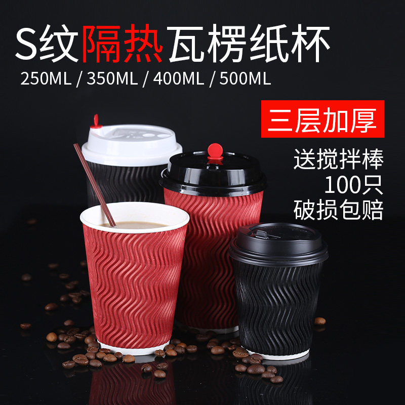 一次性纸杯双层加厚瓦楞杯防烫咖啡纸杯奶茶外卖打包杯带盖100套