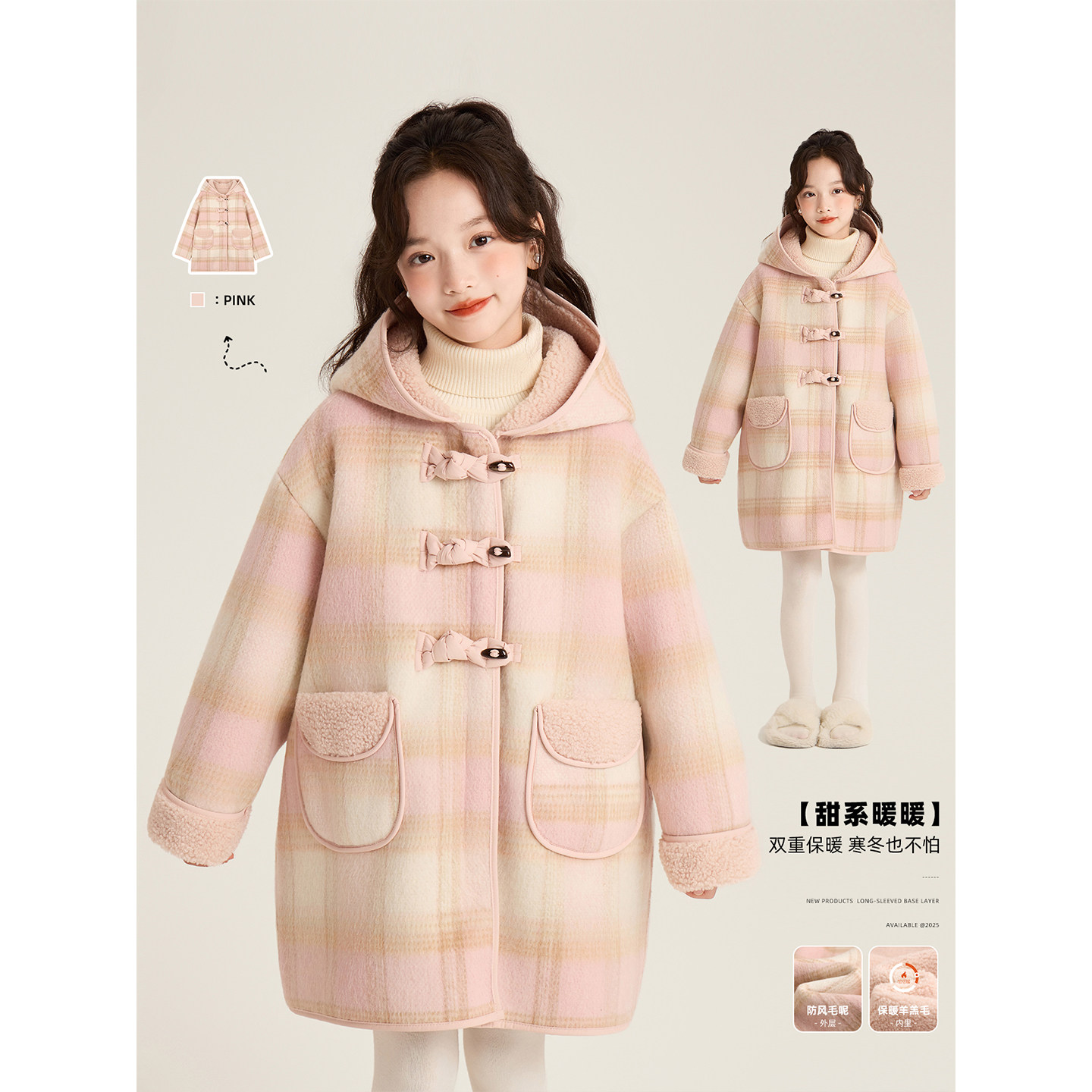Amybaby女童外套冬季2025新款保暖加绒中长款格纹连帽呢子大衣