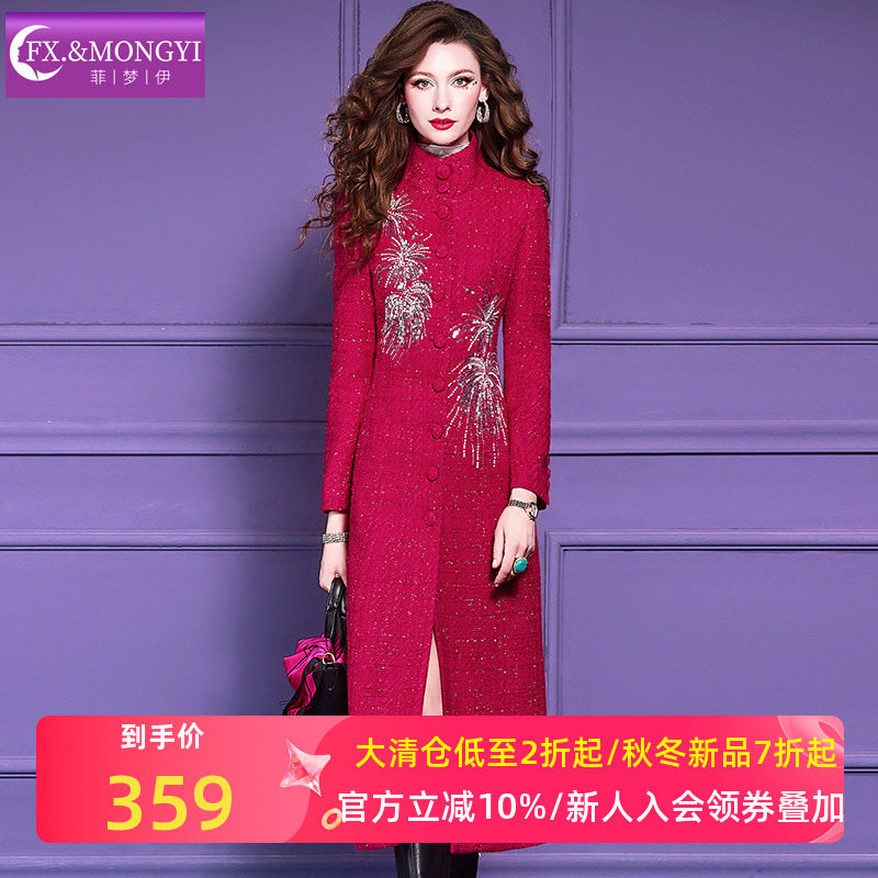 菲梦伊含羊毛亮片钉珠毛呢外套女冬季立领高端加厚中长款呢子大衣