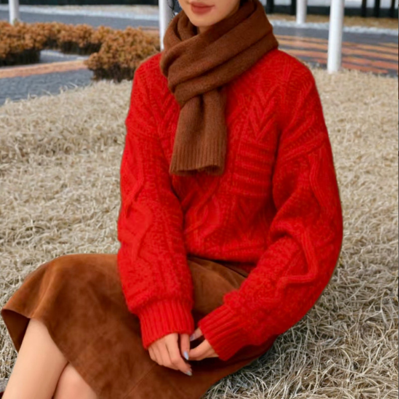 莫希 韩女慵懒粗线套头毛衣女冬宽松圆领复古红色麻花毛衫针织衫