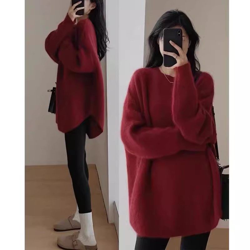 慵懒风粗线羊毛衫女秋冬中长款圆领套头毛衣宽松显瘦针织加厚大码