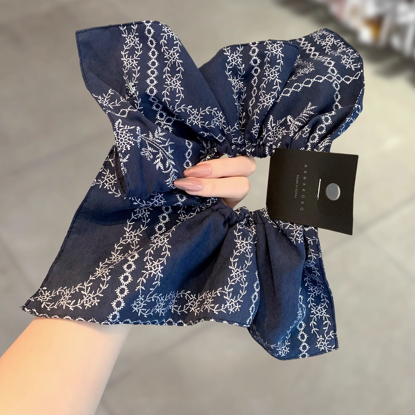 韩国复古藏蓝印花方巾发圈卡其高档慵懒风大号头绳扎马尾丸子头花