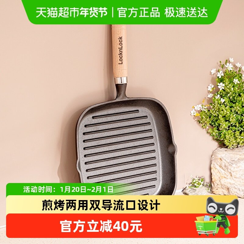 乐扣乐扣无涂层铸铁锅条纹煎牛排专用锅家用电磁炉平底锅牛扒煎锅