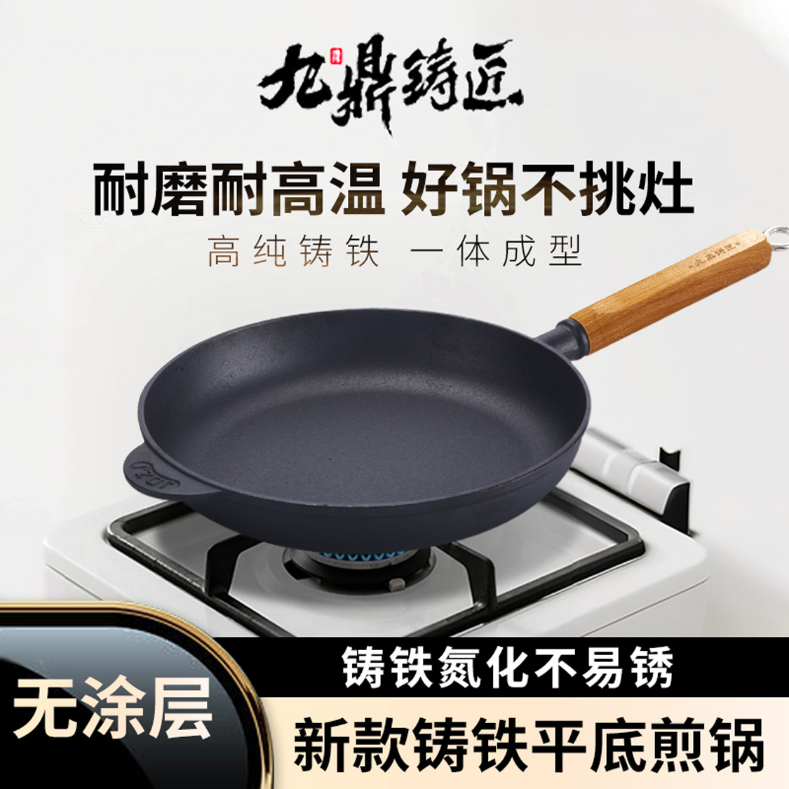 铸铁平底锅不沾锅无涂层牛排煎锅煎饼锅燃气灶适用铁锅老式烙饼锅