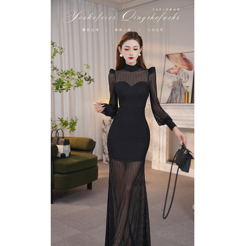 XULU原创丝绒时尚感优雅复古性感网纱透视显瘦长袖半高领连衣裙