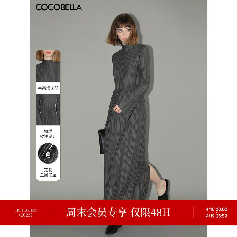 COCOBELLA赫本风压褶连衣裙女半高领抽绳长袖优雅显瘦长裙FR3015