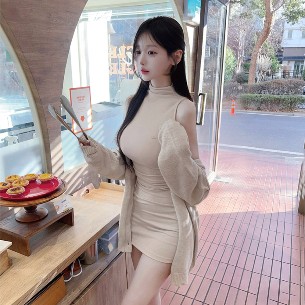 Ocnltiy打底针织连衣裙女秋冬新款修身显瘦半高领毛衣裙内搭短裙