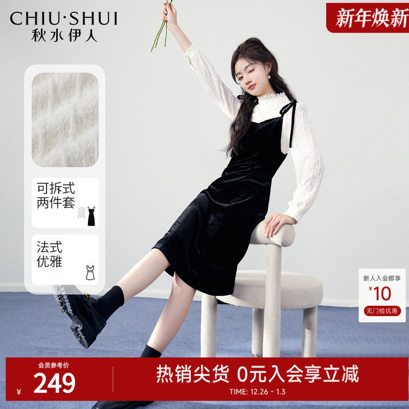秋水伊人半高领蕾丝打底衫吊带连衣裙2025年冬季新款女装丝绒套装