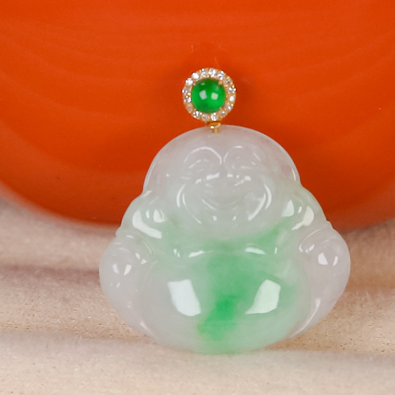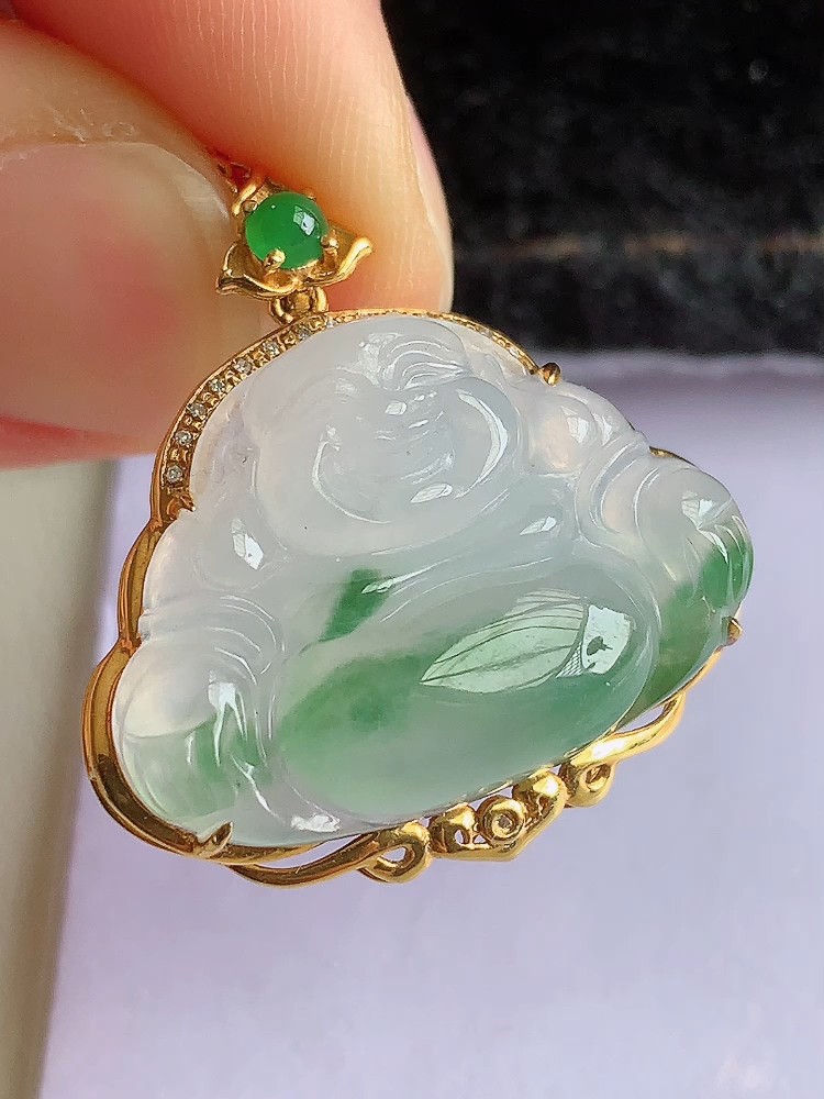 天然A货翡翠缅甸料弥勒佛18K金扣头镶嵌吊坠女款翡翠佛公挂坠饰品