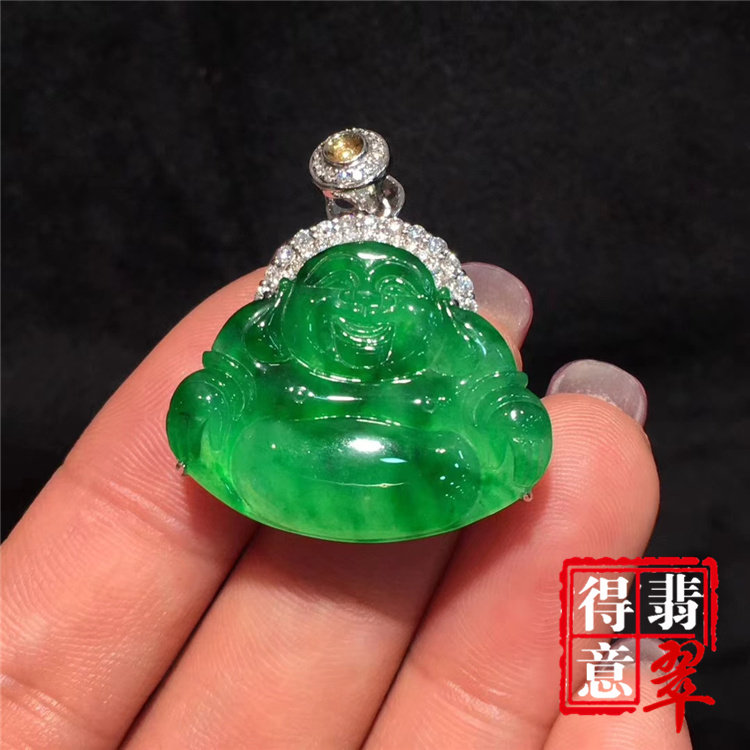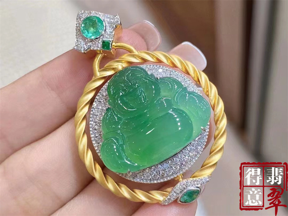 得意翡翠 天然冰种满绿翡翠佛公吊坠 高冰纯净18k金镶嵌保真带证