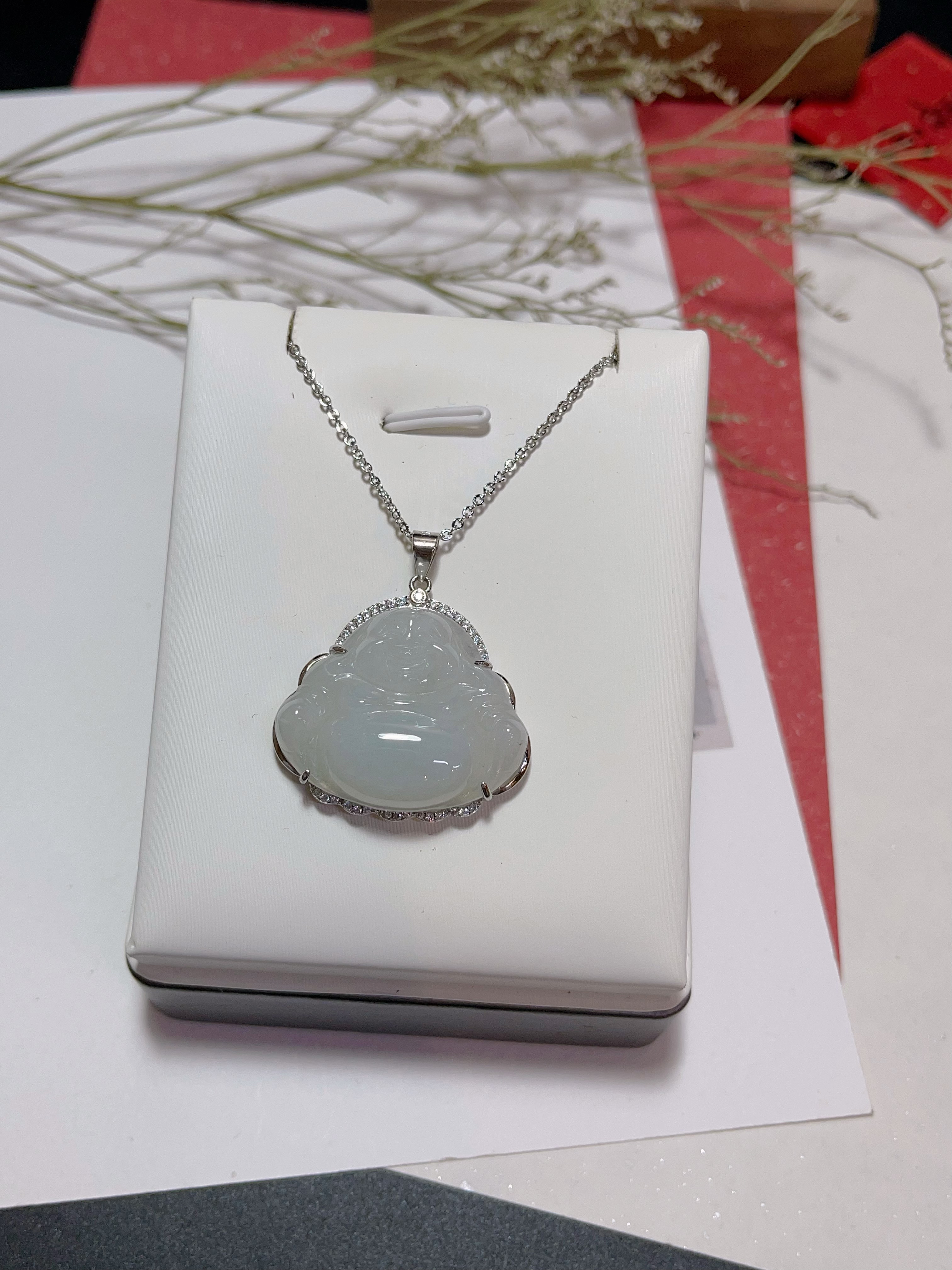 天然飘花笑佛翡翠A货玉佛吊坠玉石佛公玉坠女款弥勒佛S925银项链