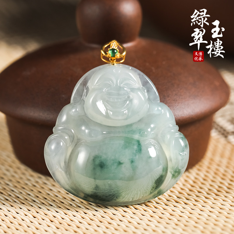 绿翠玉楼缅甸老坑A货翡翠佛公吊坠女款18K金镶玉挂件玉石笑佛玉佛