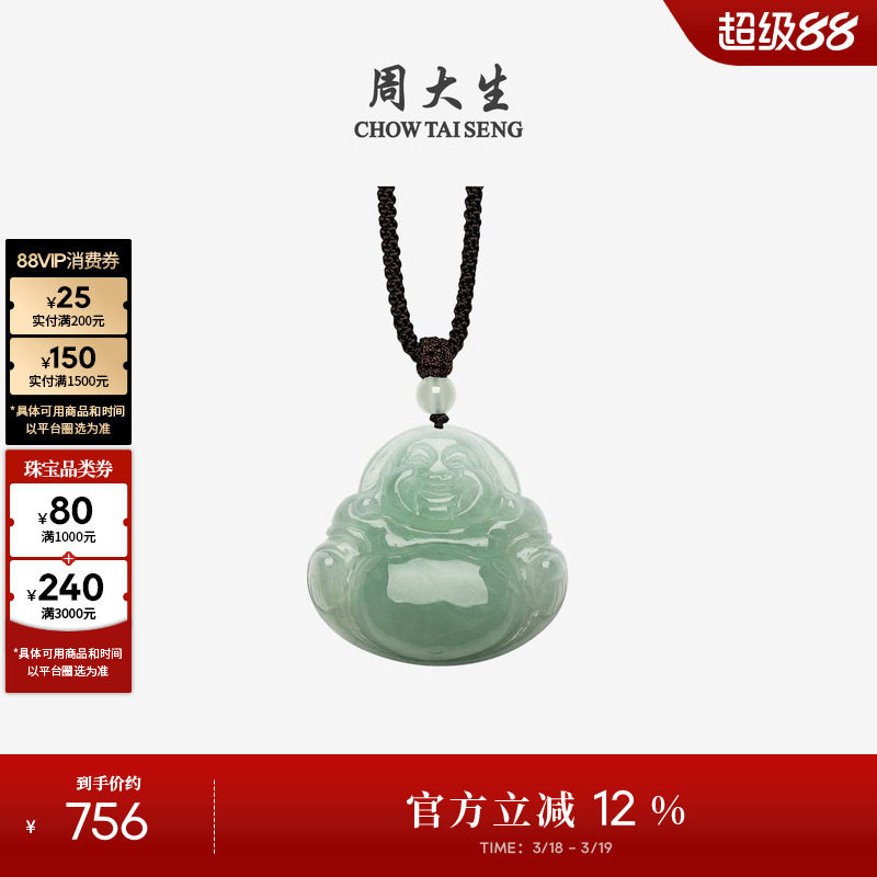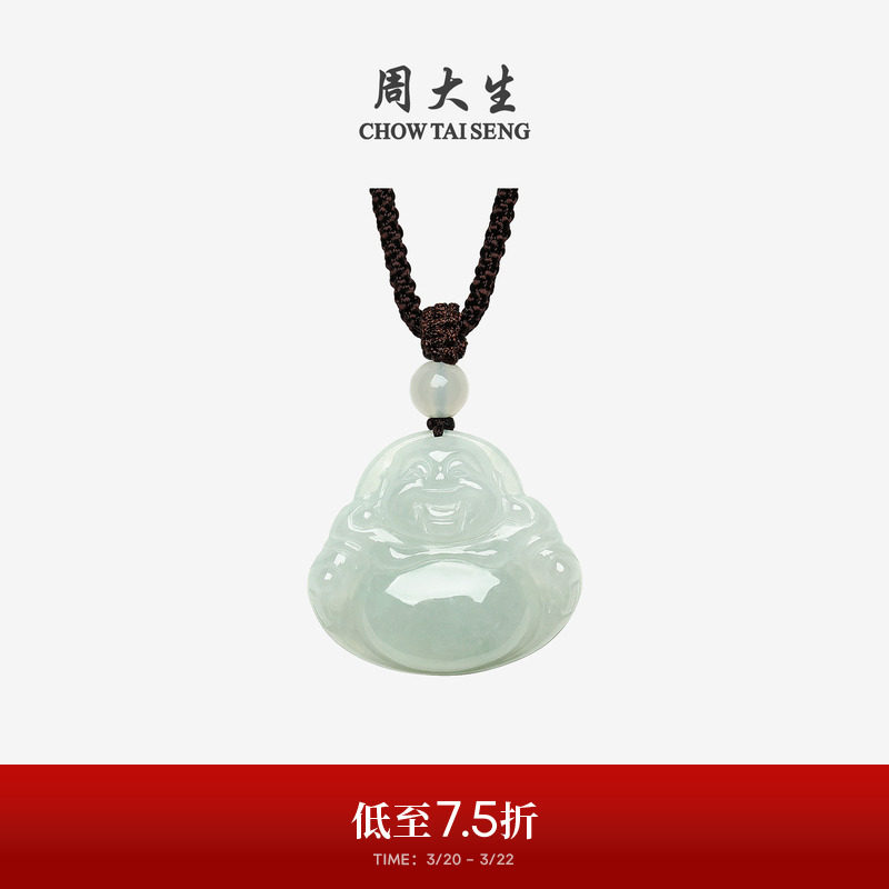 周大生天然翡翠吊坠女糯种浅绿佛公挂坠带编绳情侣生日礼物送女友