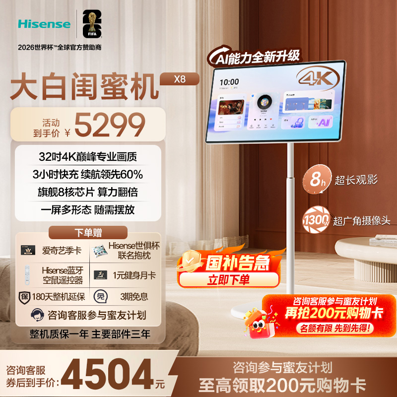 Hisense/海信大白闺蜜机X8 Pro 32英寸4K长续航柔光护眼屏 8GB+256GB大平板 可移动电视 随心屏智慧屏
