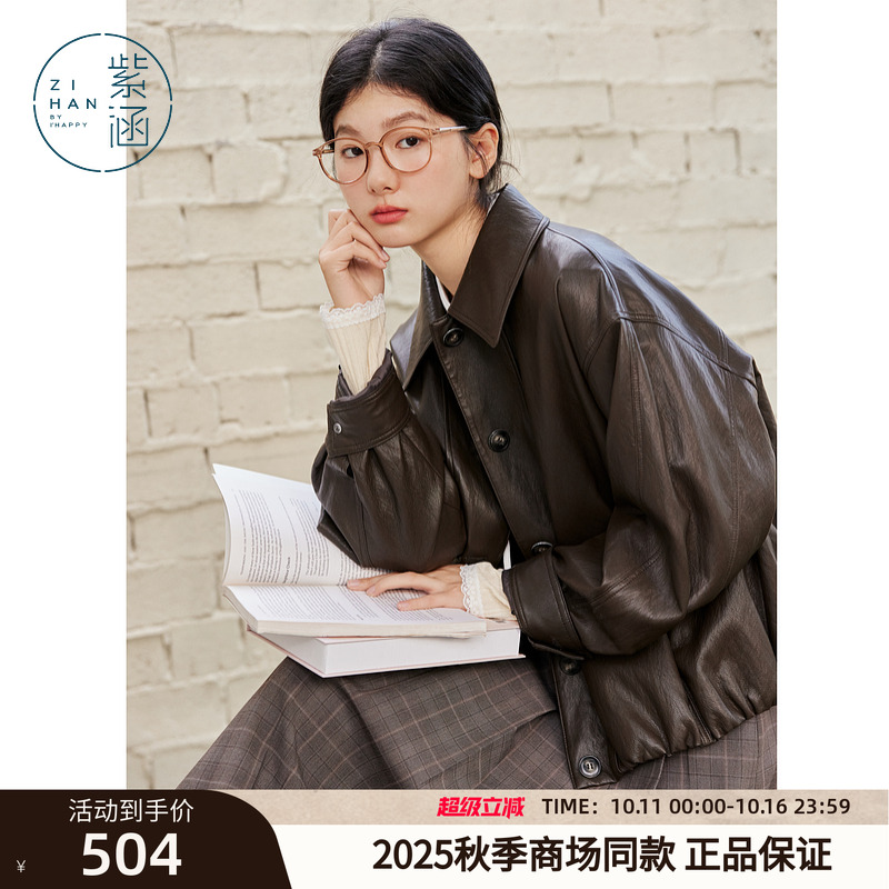 紫涵短款翻领皮衣女2025秋季新款复古简约百搭单排扣宽松夹克外套