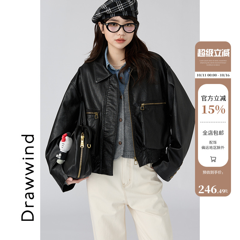 画风drawwind短款皮衣女2025新款秋季小个子休闲宽松机车夹克上衣