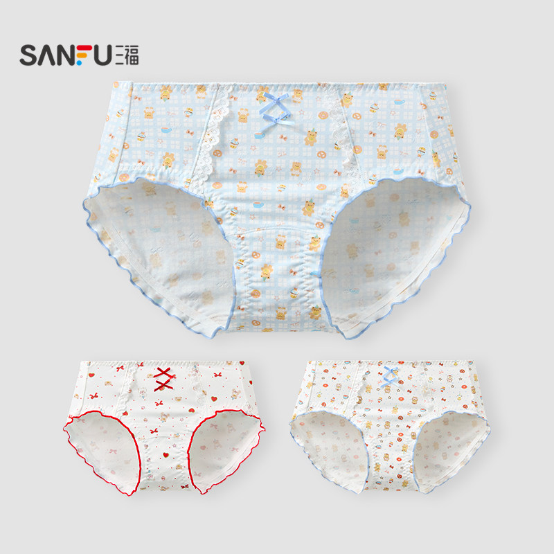 三福 女中腰不夹臀内裤 可爱卡通印花蝴蝶结透气半平角裤520514