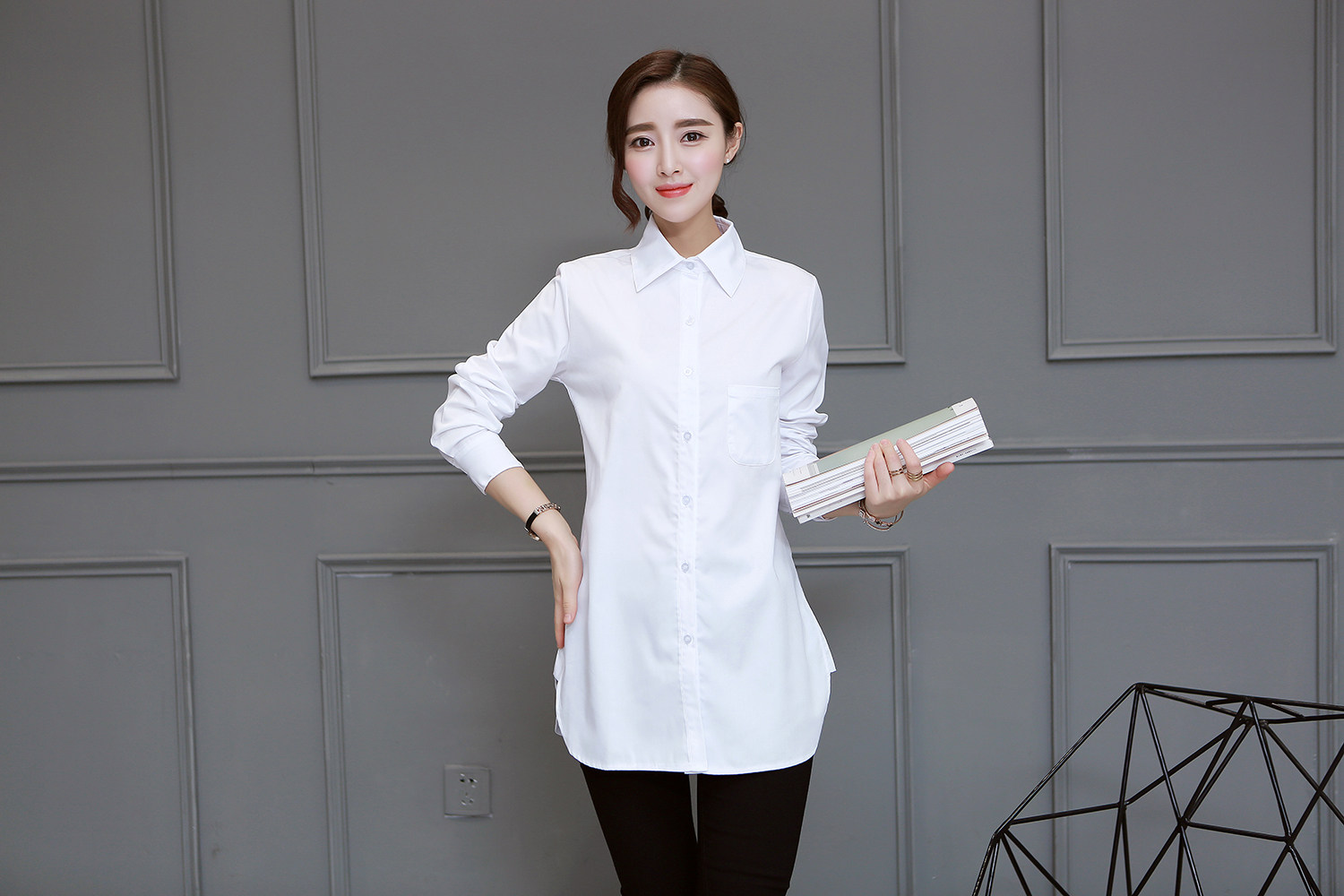 2020春秋韩范白衬衫女长袖中长款宽松百搭学院风职业工装打底寸衫