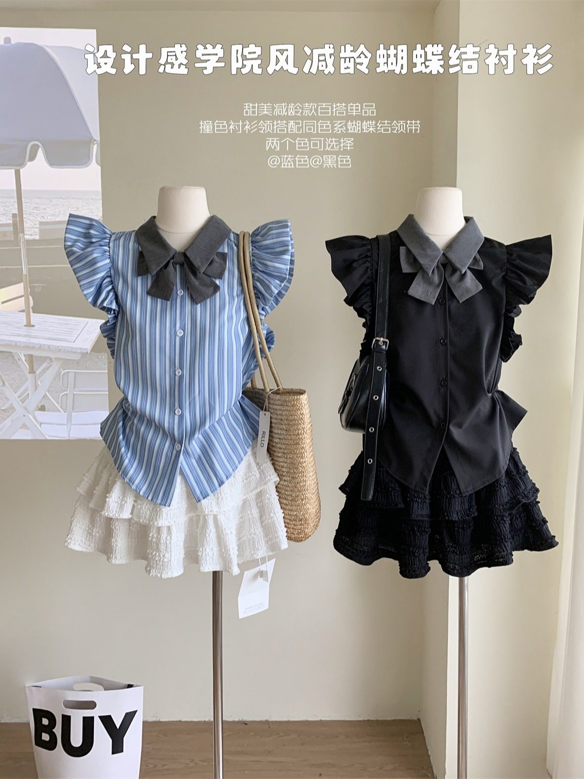 学院风法式小飞袖蝴蝶结条纹衬衫女夏设计感小众别致衬衣短袖上衣