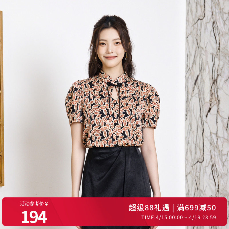 婉甸夏季米底暮夜斑驳旗袍式上衣立领雪纺衫1242H24YT3