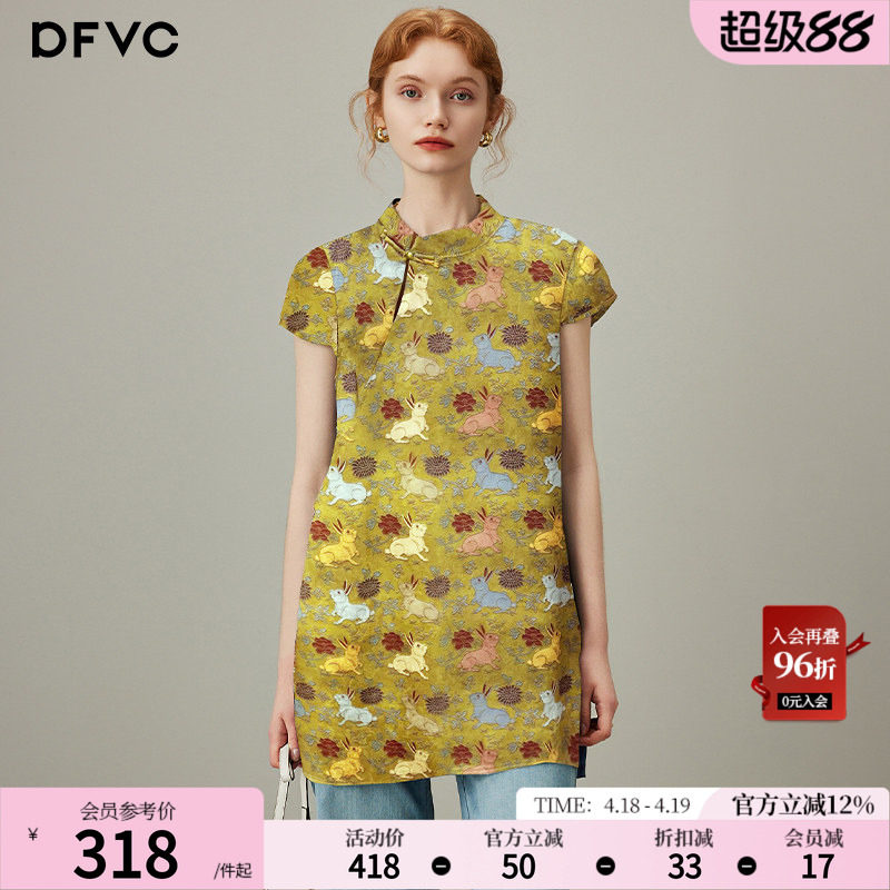 dfvc奥黛新中式国风印花衬衫女2026年夏季新款立领中长款旗袍上衣