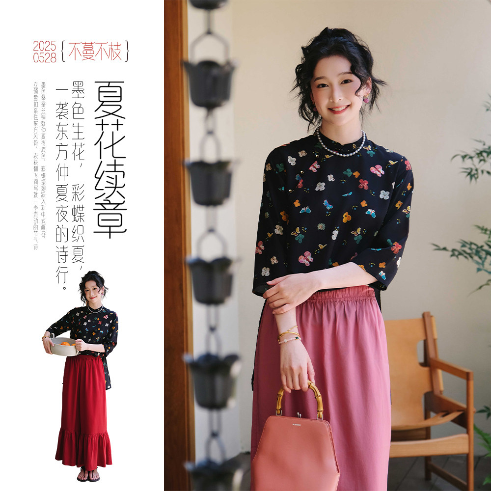 不蔓不枝【蝴蝶泉边】桑蚕丝改良旗袍短上衣小衫蝴蝶印花减龄夏季