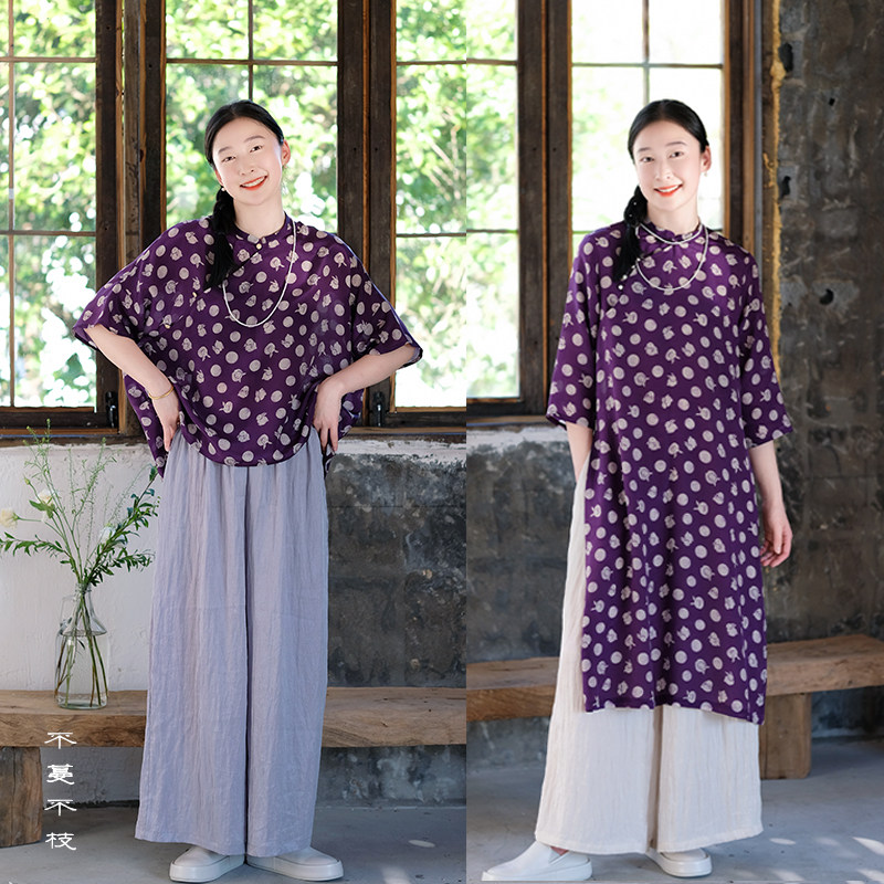 不蔓不枝【灵彩】12姆米桑蚕丝波点印花改良旗袍连衣裙短上衣夏季