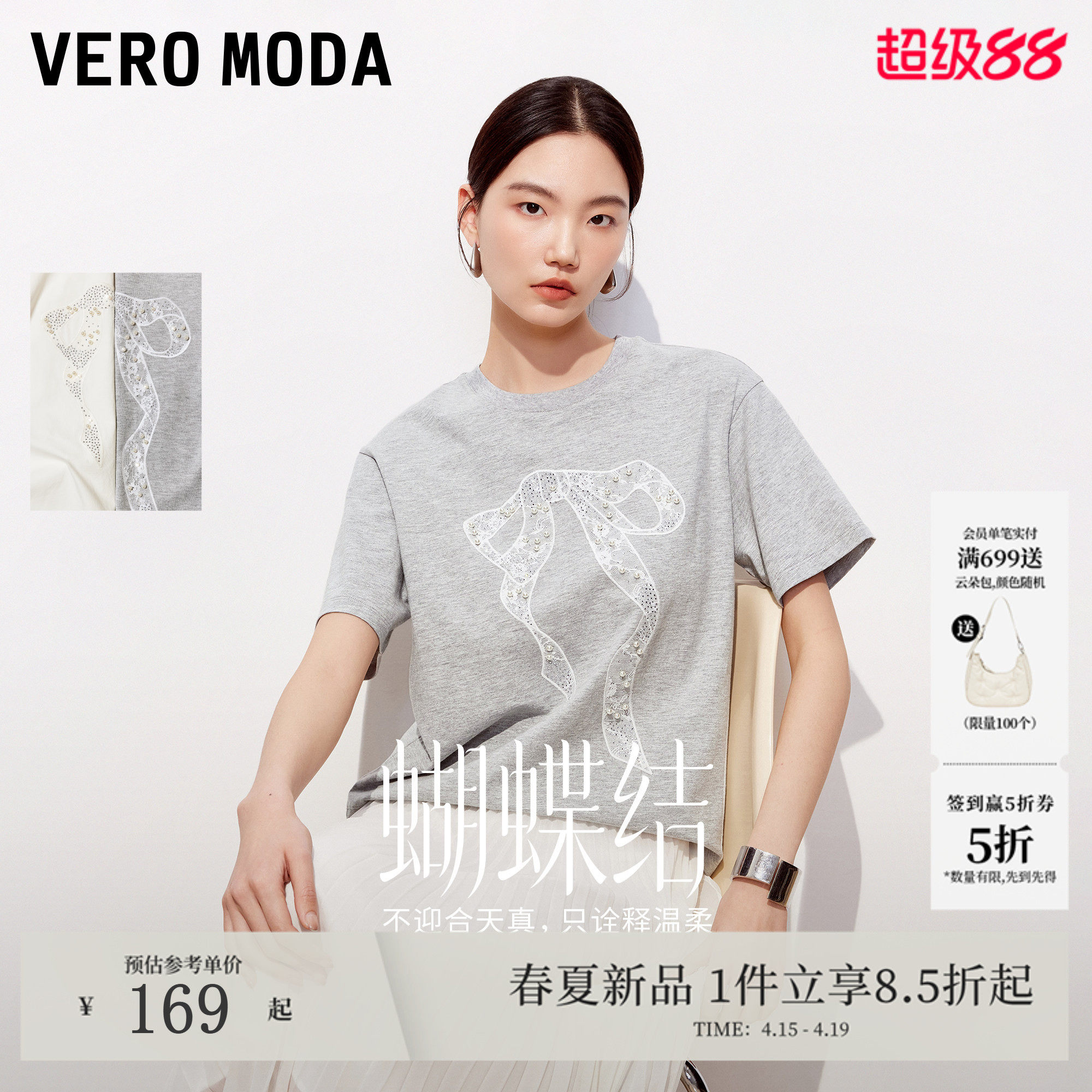 【蝴蝶结】Vero Moda套装26夏季纯棉短袖蕾丝钉珠水钻T恤连衣裙