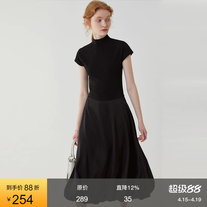 范洛2026夏季新款黑色高级小众半高领T恤拼接缎面光泽感连衣裙女