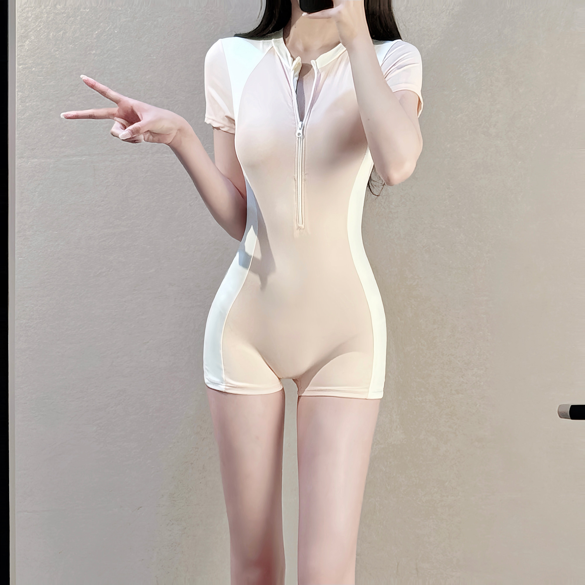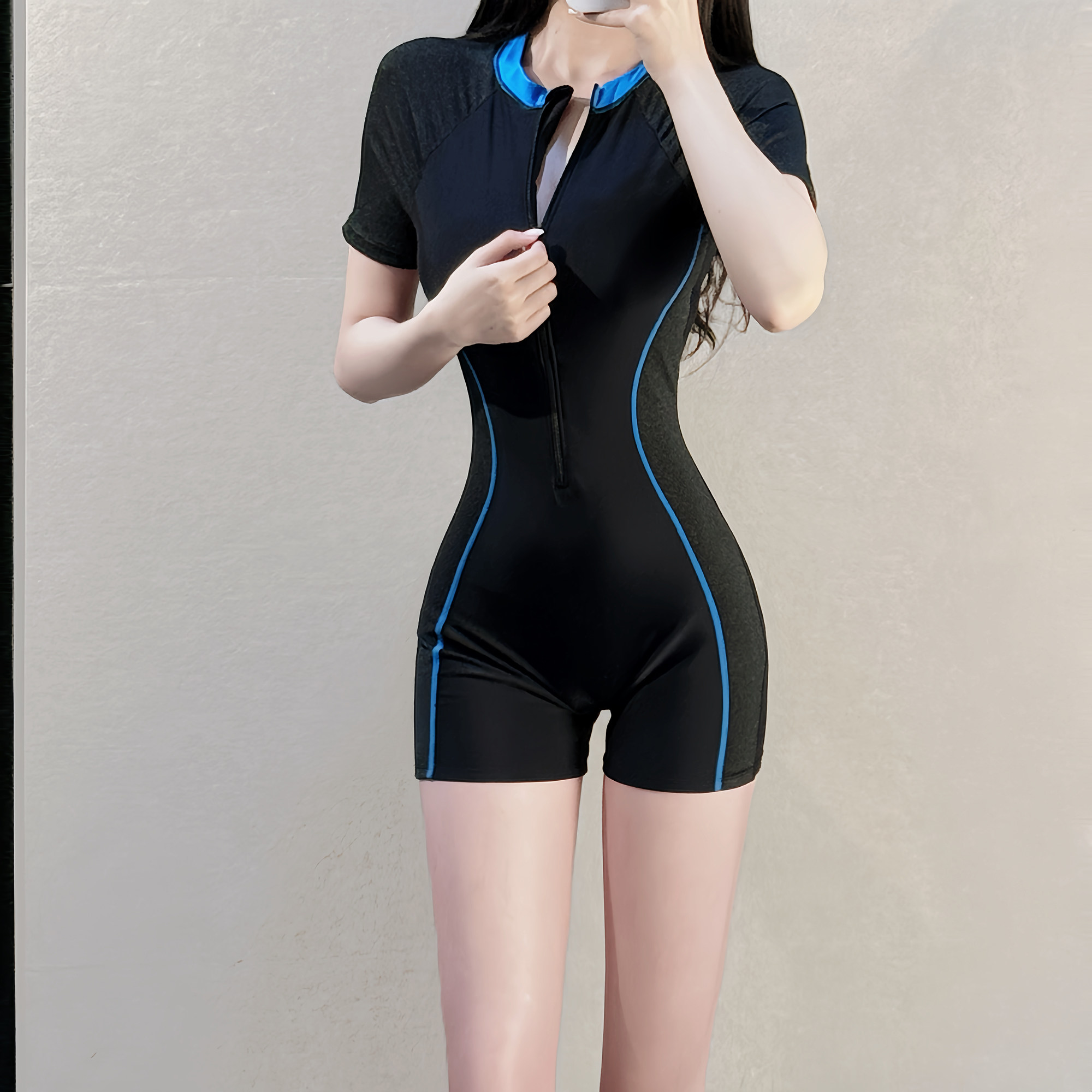 短袖拉链拼色简约连体游泳衣女平角学生保守显瘦浮潜冲浪度假温泉