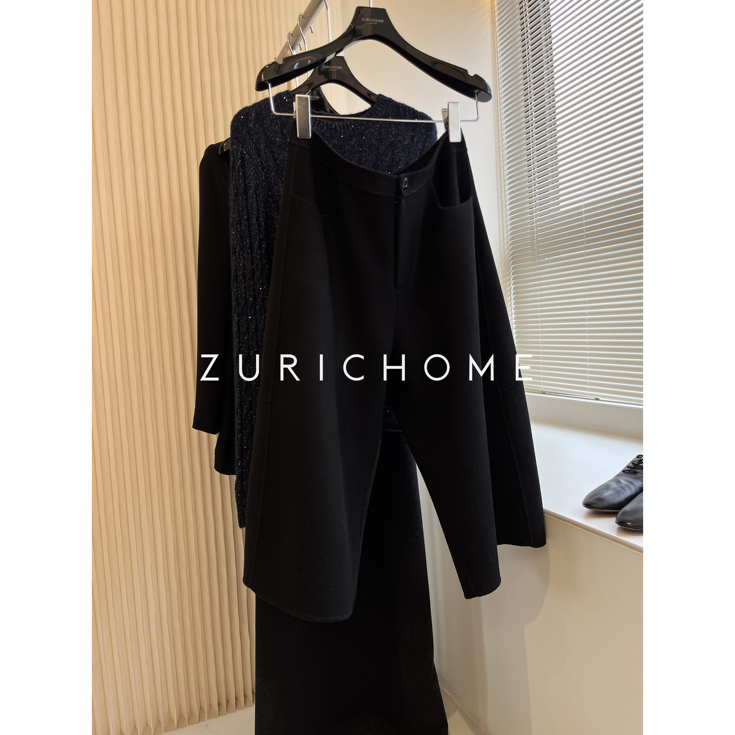 ZURICH HOME 及简大气 百搭 肌里质感立裁黑色廓型七分弧形羊毛裤